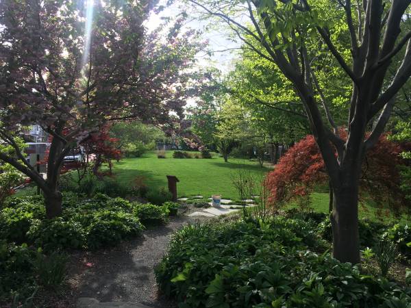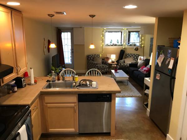 Spacious Sunny One Bedroom English Basement Apartment in Renovated Victorian. Front door opens on quiet, tree lined street. Rear opens on lovely Crispus Attucks Park. 760 square feet (bedroom 10×12), central air, stainless steel appliances, washer/dryer, polished concrete countertop and floor.