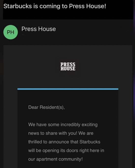Thanks to Mike for sending: “a new Starbucks opening up near union market in the press house building. Press House sent out a notice to residents confirming that it is in fact a Starbucks”