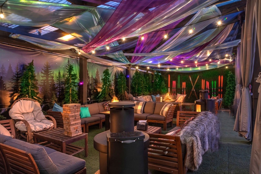 “The garden at Hook Hall, Georgia Avenue bar and event space, has been transformed into its winter theme, Northern Lights, paying homage to the dancing waves of lights of the Aurora Borealis. The entire garden is draped in iridescent fabrics, accented by large pine trees, firepits and thousands of twinkling lights throughout.