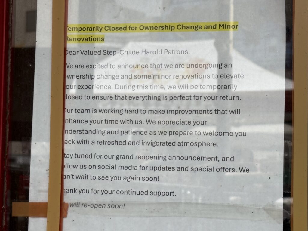 Thanks to Rudi for sending: “Step Childe Harold closed (temporarily?) due to new owner: