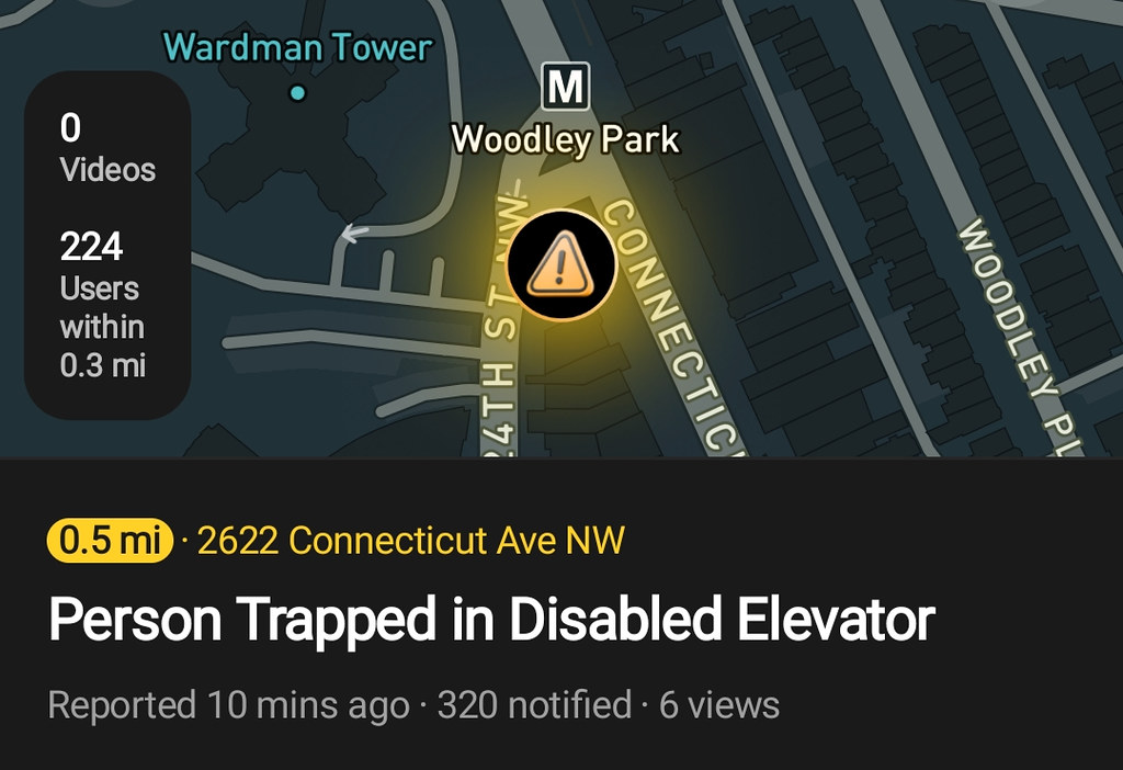 “I saw that the Woodley Park metro elevator has new signs, but I just got this notice that someone is trapped in an elevator at the address of the metro entrance on the Citizen app. I know the elevator is actually a block away but could this be referring to the metro elevator? That’s the only elevator I know in the area: