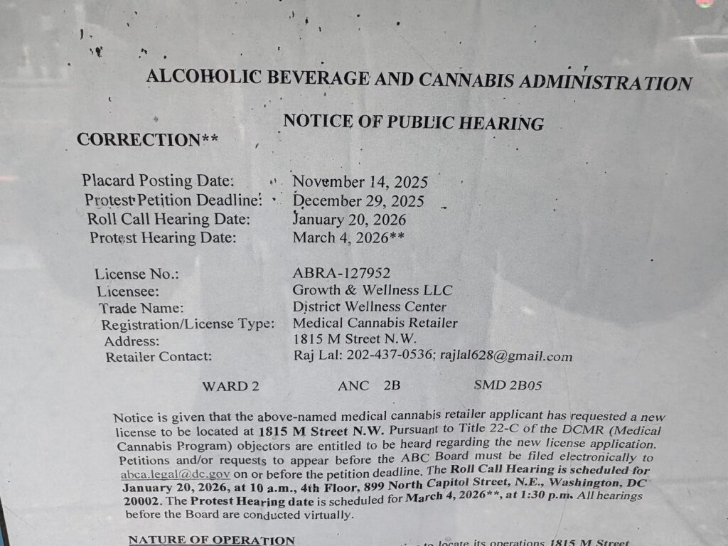 “The medical cannabis retailer applicant is requesting to locate its operations 1815 M Street N.W. The proposed facility with approximately 1,480 square feet of space will provide cannabis flowers, cannabis concentrates, and a line of edible products and home delivery services to registered patients in Washington, D.C. The applicant is requesting Delivery, Educational Tasting, Safe-Use Treatment Facility and Summer Garden endorsements.”