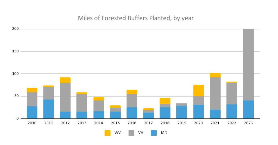 Figure 1. Miles of Forested Buffers Planted, by year. Potomac River Report Card, 2025. (https://potomacreportcard.org/)