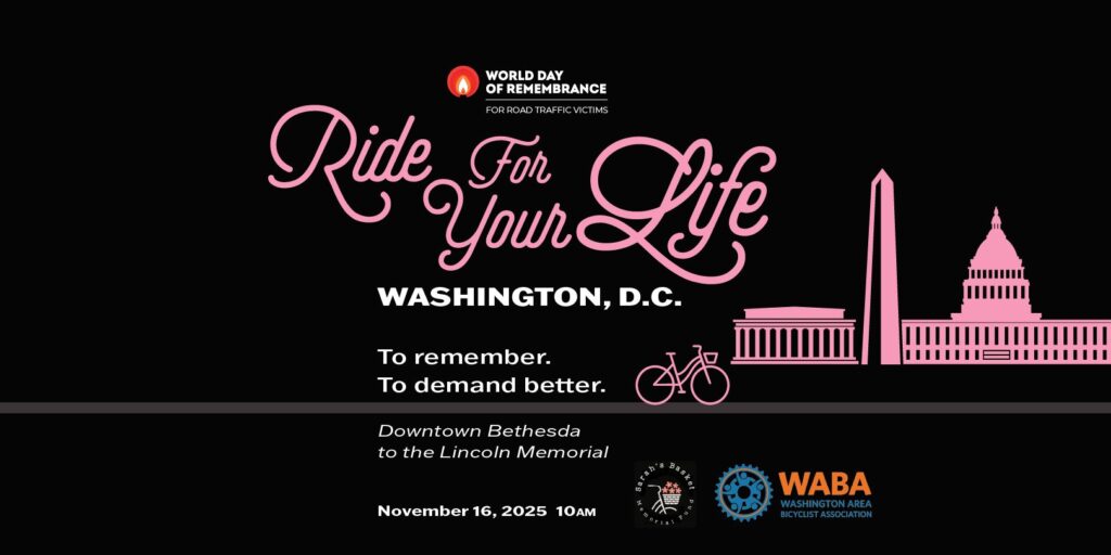“Now in its fourth year, the Ride for Your Life is a 10-mile slow ride from downtown Bethesda to the Lincoln Memorial that is expected to bring over 1,000 cyclists and others together to honor victims of roadway violence and demand change to protect road users.