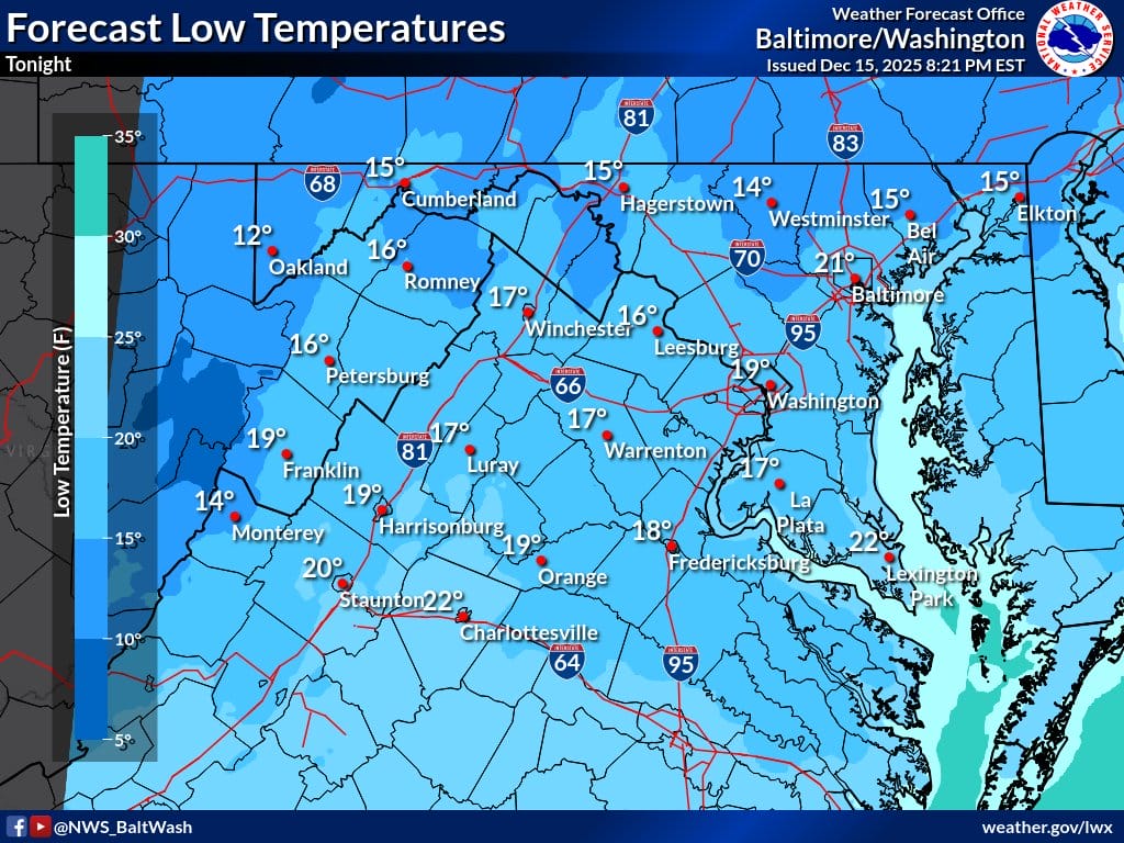 Last night NWS shared: “It stays cold tonight with fewer clouds the second half of the night. While winds will be much lighter compared to last night, there will be enough in the higher elevations for wind chill values to reach the single digits.”
