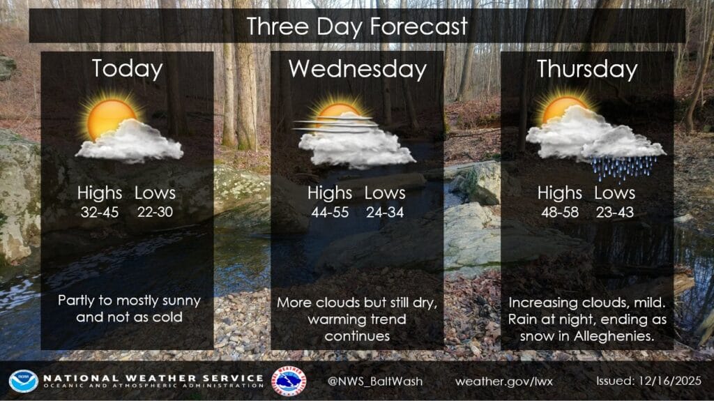 A bit of a warm up (and rain) is coming though: “Dry weather will continue through early Thursday with a steady warming trend. A cold front will bring widespread rain Thursday night, which will end as snow Friday morning in the Allegheny Mountains.”