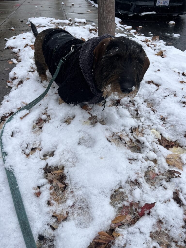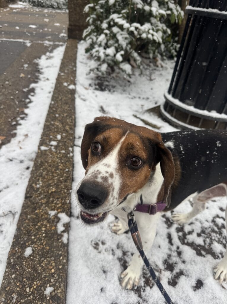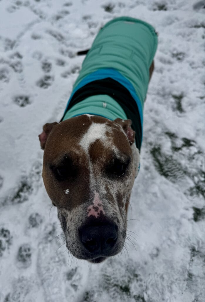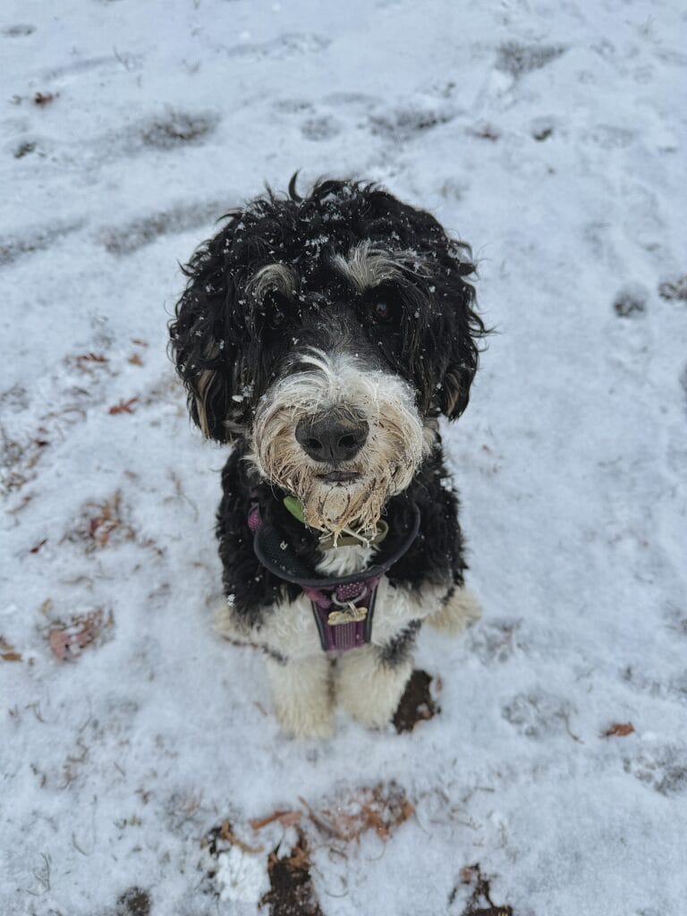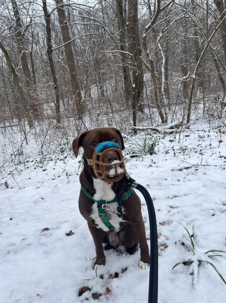 “Fin got some snow stuck in his basket muzzle!”