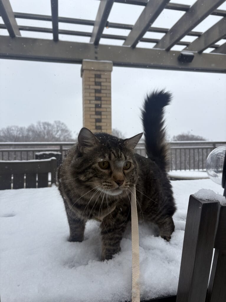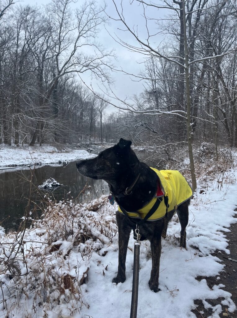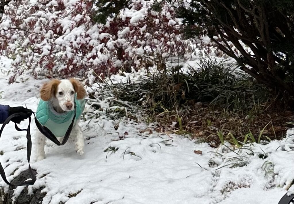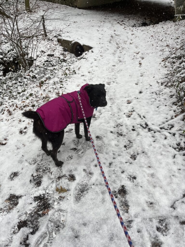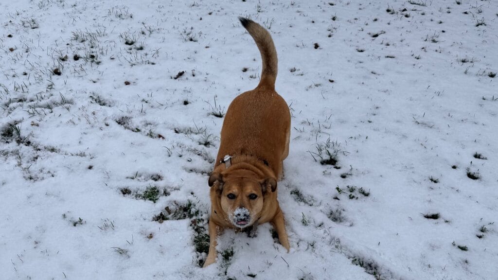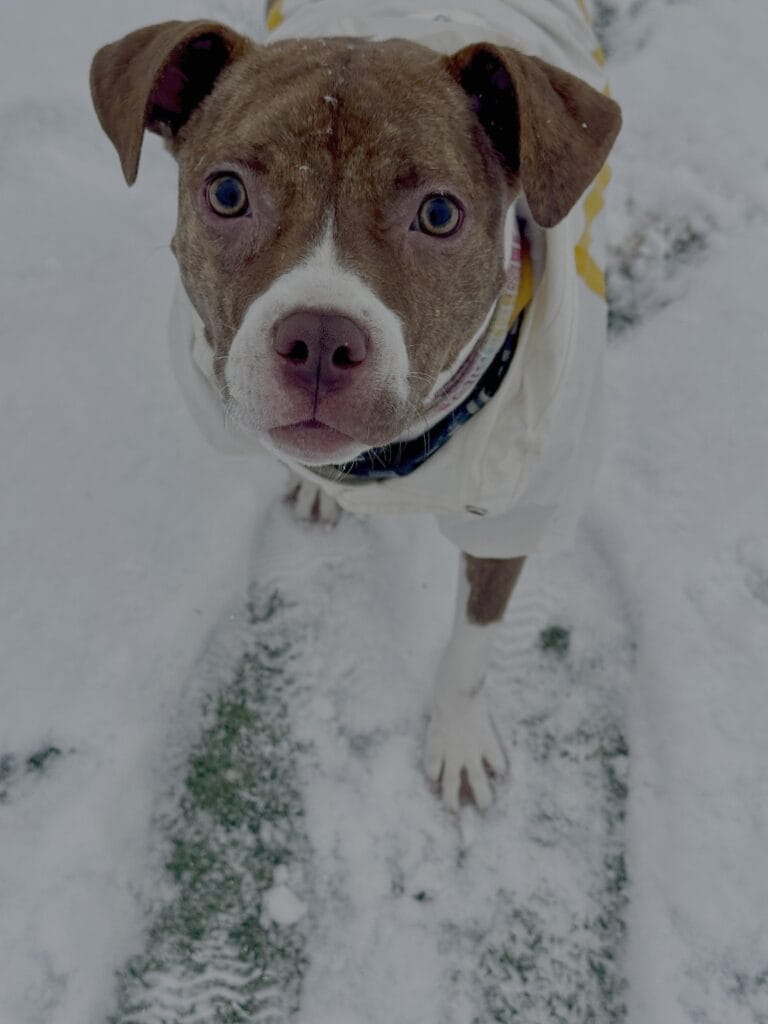 “Fin got some snow stuck in his basket muzzle!”