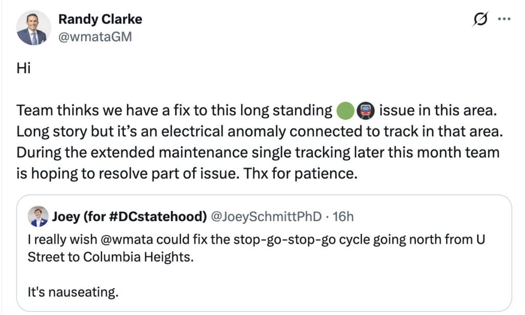 “Team thinks we have a fix to this long standing π’π issue in this area. Long story but itβs an electrical anomaly connected to track in that area. During the extended maintenance single tracking later this month team is hoping to resolve part of issue. Thx for patience.”