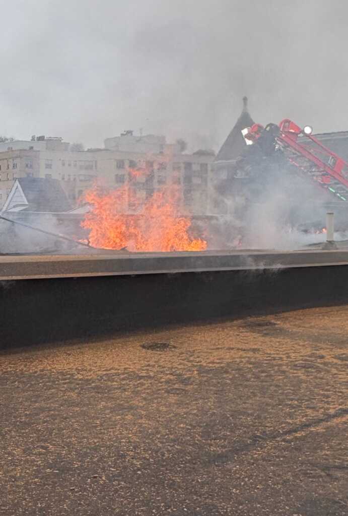 “Now 2 Alarm Fire 2100 block 13th St NW. Had fire in attic thru roof 3 story attached row with fire threatening both adjacent homes. Bulk of fire knocked down via aggressive interior operations.”
