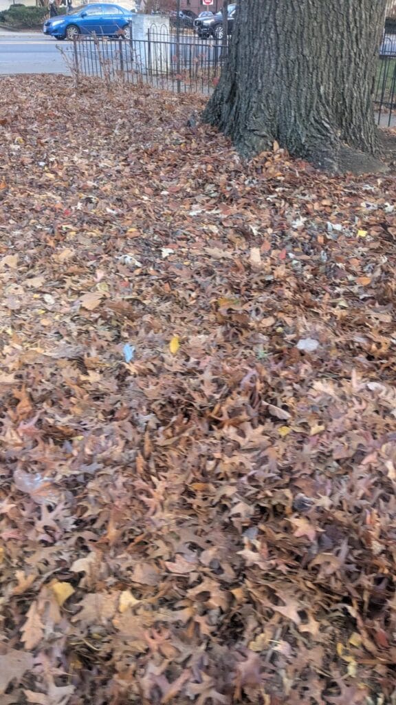 This space that I’m pretty sure is just owned by DC. I had hired contractors removing all the leaves. So it’s been cleared even though it’s under a huge tree. Well, this lady came by with massive bags of leaves and just dumped them all and spread them around.