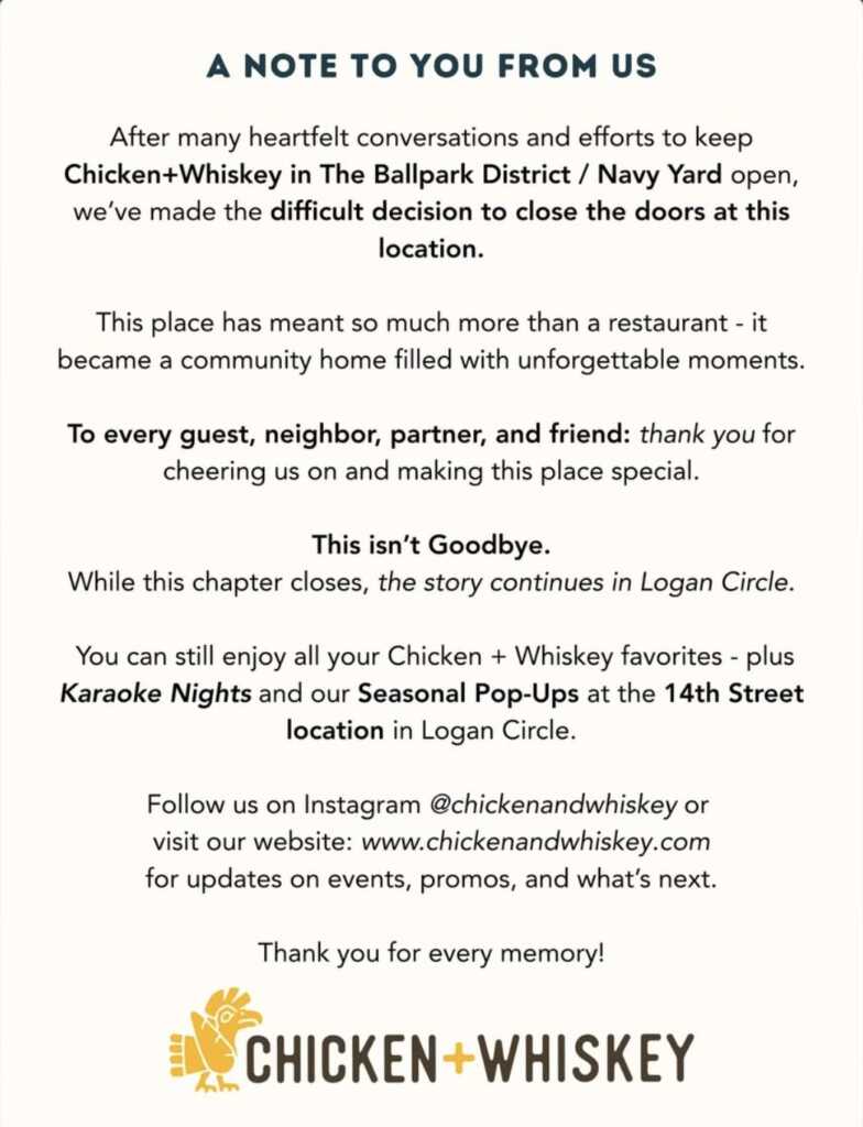 “To our Chicken + Whiskey community in the Ballpark District: We are incredibly grateful for all the love and support we received through the years in Navy Yard. 🧡 Thank you!