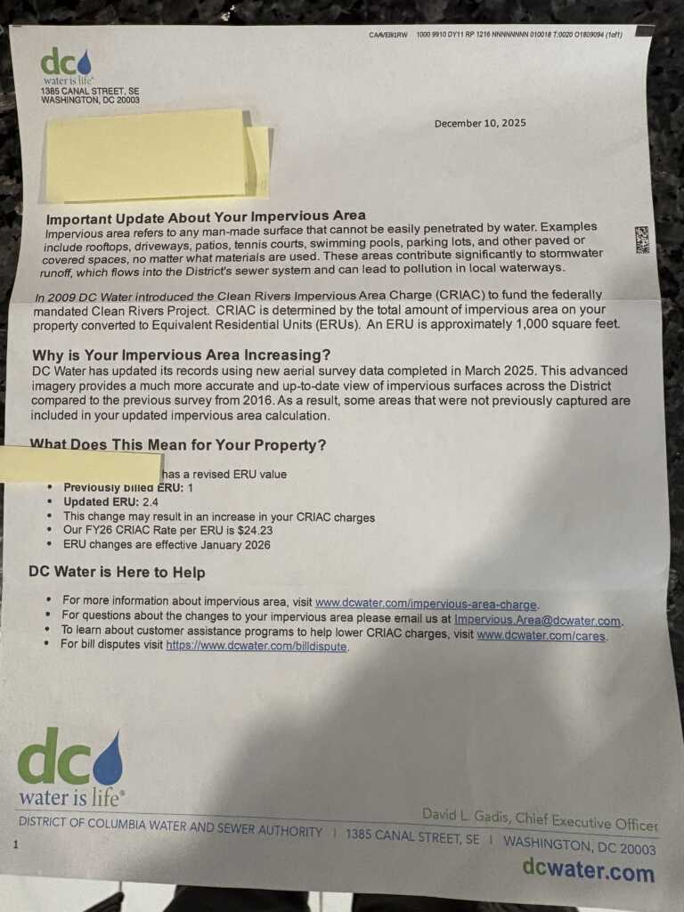 What’s going on with DC Water … around the change in impervious area measurements? I got a letter over the holidays with a huge increase, only for DC Water to announce a pause in implementation. Wondering if this was citywide? So much opacity!
