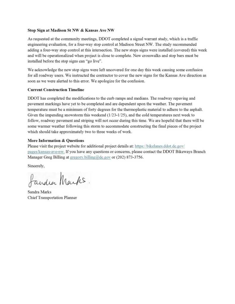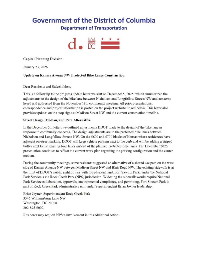 “DDOT has made design changes to the Kansas Ave NW bike lane between Nicholson & Longfellow Streets based on community feedback. Instead of protected bike lanes, DDOT will maintain curbside parking and add a striped buffer.