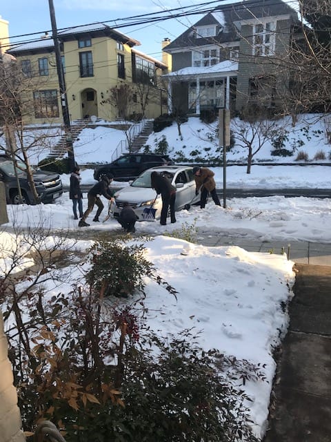 “An act of collective altruism took place this afternoon outside Teaism in Dupont Circle. An SUV got stuck in the haphazardly plowed roads across from the tea house, its wheels spinning out as it tried to breach a small snow bank. A few folks tried to get the car moving, unsuccessfully. Then, in a flurry, a group of employees from Teaism filed out front, one by one, adorned with aprons in place of winter coats, and helped propel the car to freedom. The district may not have the perfect infrastructure to deal with the inundation of the winter storm, but DC’s citizens prove once again that they’re able to face unexpected challenges, together and head-on.”