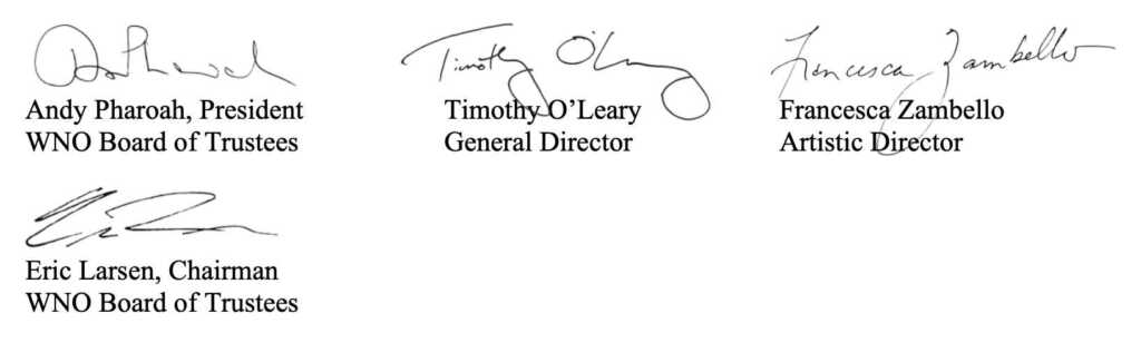 Our formalized affiliation with the Kennedy Center was never intended to be permanent, and this has become the ideal moment to move forward on different paths. This parting gives both organizations maximum flexibility to pursue our respective goals. WNO is committed to continuing our work and celebrating our 70 th anniversary as a fully independent, non-profit producing entity, separate from the Kennedy Center.