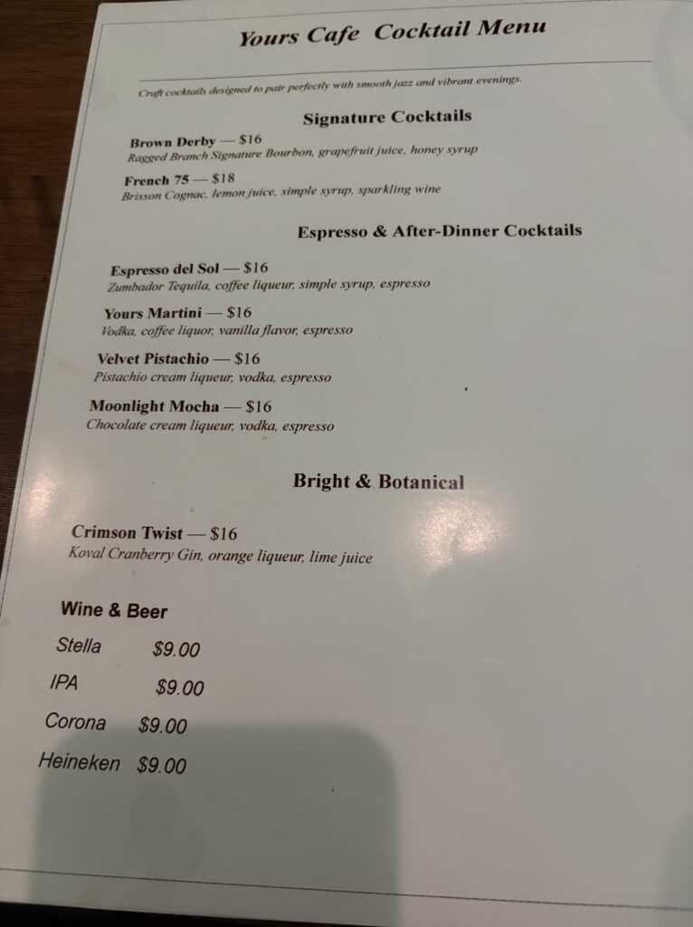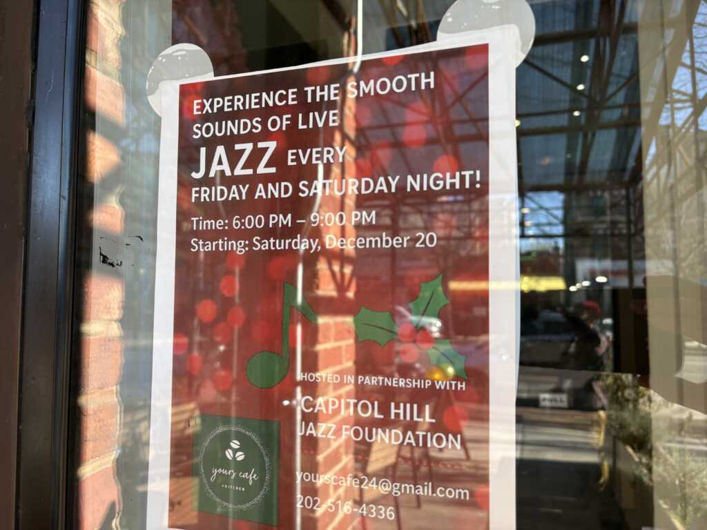 Yours Cafe at 2619 Connecticut Ave. is having live jazz with the Herb Scott Duo on Fridays and Saturdays from 6-9 pm, no cover. Their dinner menu is not online yet, but they have both Ethiopian and other food — pasta, salmon, chicken, etc. Entrees are around $20 and very tasty. We had the roasted salmon and the penne oslo, with triple chocolate pudding for dessert. The music was enjoyable too — Herb is a DC native and very talented saxophonist. During the daytime they roast their own coffee beans and serve pastries and brunch items. Check it out!”