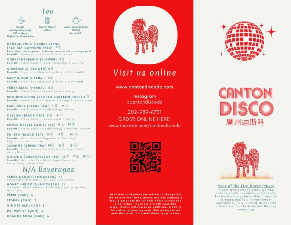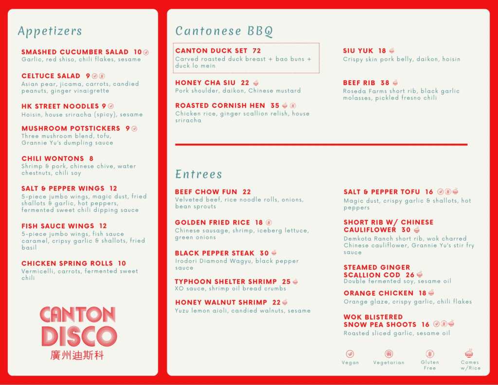 Chef Timothy Yu, son of Janet and the late Alan Yu, founders of Hollywood East Café in Wheaton, Maryland, grew up working in his family’s restaurant, which became a cornerstone of the region’s Chinese dining community. At Canton Disco, Yu presents a menu inspired by Cantonese flavors, drawing from familiar concepts and reinterpreted with his own modern, playful twists. The dinner menu focuses on Cantonese BBQ, seafood, noodle dishes, and shareable plates suited for both small groups and larger gatherings. Signature items include the Canton Duck Set with roasted duck breast, bao buns, and duck lo mein; honey char siu pork shoulder; crispy siu yuk pork belly; black pepper Wagyu steak; typhoon shelter shrimp; honey walnut shrimp; and steamed ginger scallion cod. Full menus are provided.