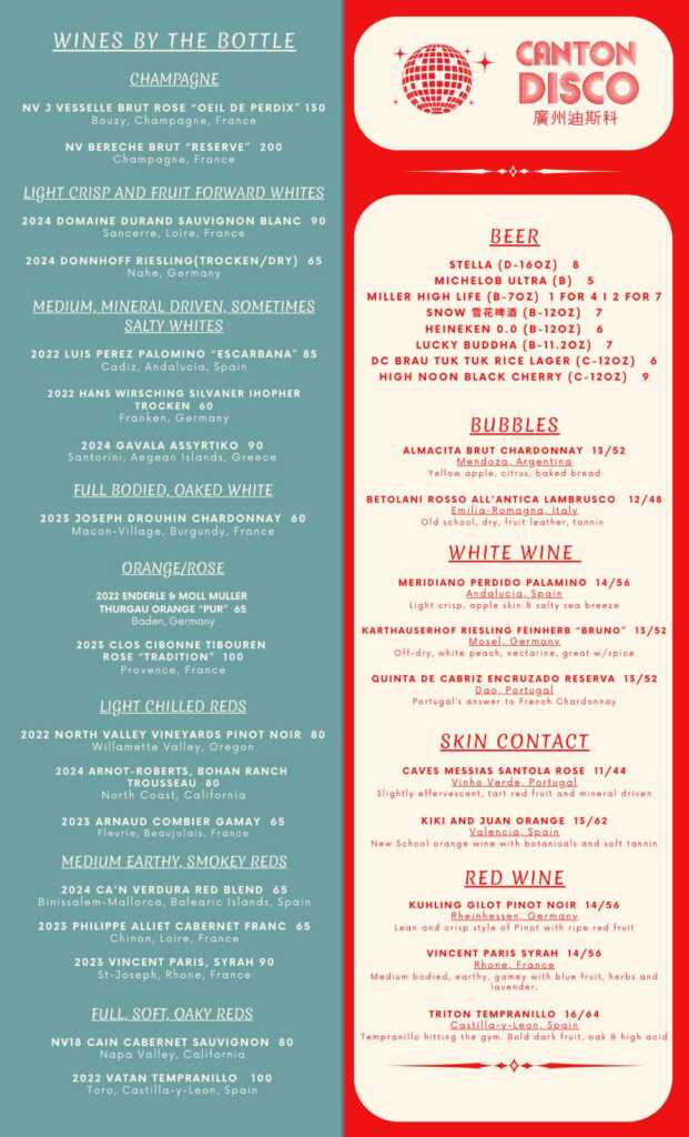 The beverage program is led by Brent Kroll, recently named a 2026 James Beard Award semifinalist for Outstanding Professional in Beverage Service for his wine bar, Maxwell Park. At Canton Disco, Kroll oversees a beverage program designed to pair with the menu across wine, beer, tea, and spirits. The cocktail list includes twelve tea-infused cocktails inspired by the animals of the Chinese zodiac, including the Lychee Blossom Martini, Kowloon Cosmo, Hainan Smuggler, Gunpowder, South of the River, and Silk Road Old Fashioned. The wine list focuses on food-friendly bottles from France, Germany, Spain, Portugal, Greece, and California, supported by a focused selection of beer and sparkling wines.