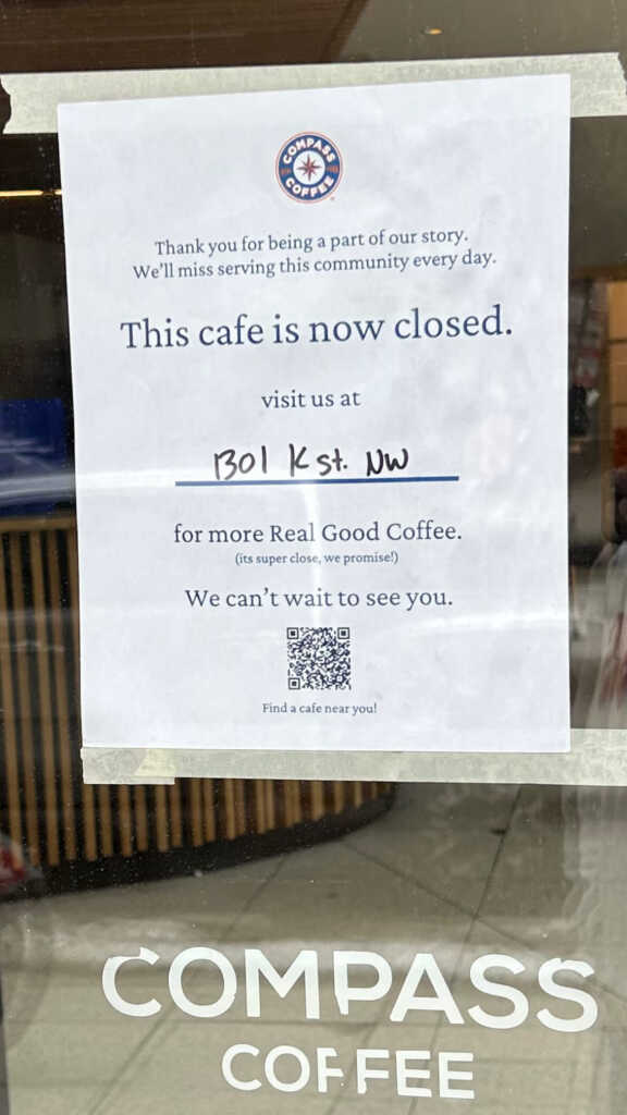 Thanks to J. and N. for sending the lastest Compass Coffee closure: “Compass 14th and I closed.”