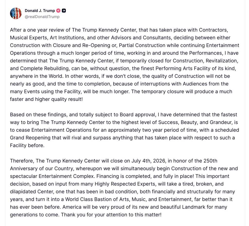 “The Kennedy Center for the Performing Arts will close for roughly two years to allow for extensive renovations, President Donald Trump said Sunday, a move that comes as the nation’s preeminent arts institution contends with a flood of cancellations.”