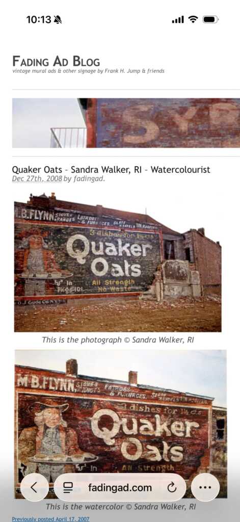 “Found this photo of an ad in DC by artist Sandra Walker (who made a watercolor of it). It’s not the same ad and no location given, but it has the slogan “3 dishes for 1 1/2 cents” so it might be a Quaker Oats ad! The ad in the Walker photo is for MB Flynn but I haven’t been able to find anything about them. Looks like maybe it’s a building supply / hardware store?”