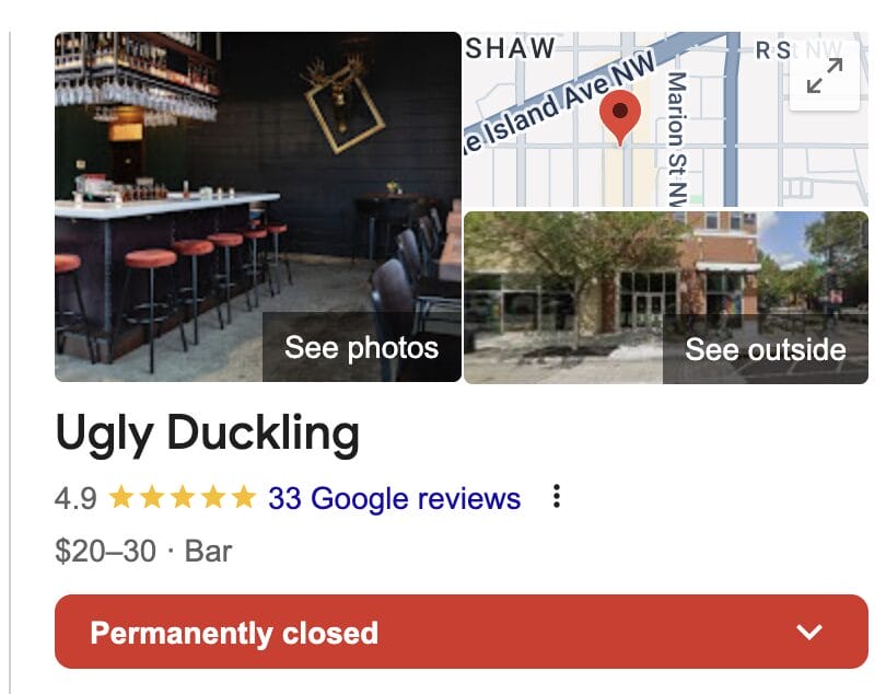 Thanks to Peter for sending word: “Ugly duckling in Shaw closed. Their Instagram is gone and there’s a sign on the door that they’re closed.”