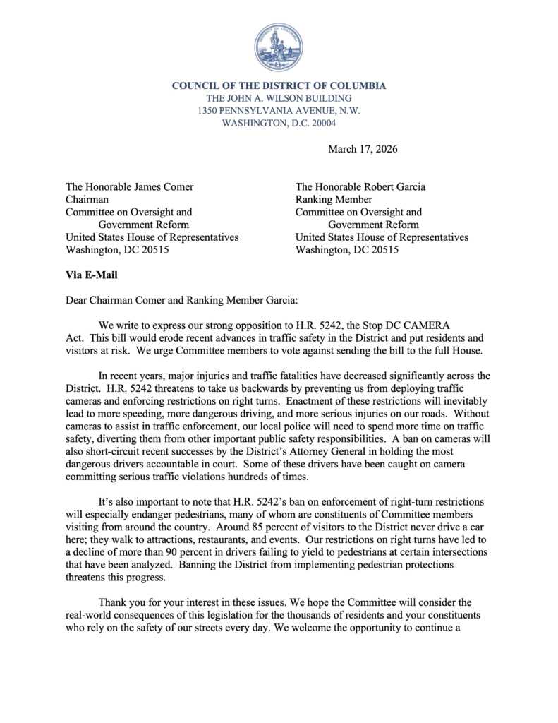 “The Council sent a letter to the Hill expressing strong opposition to HR 5242. This bill would erode recent advances in traffic safety and put residents and visitors at risk. It will inevitably lead to more speeding, more dangerous driving, and more serious injuries on our roads.”