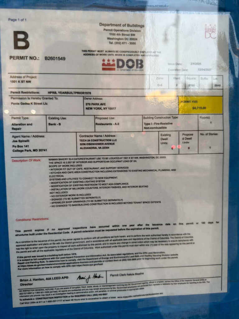Thanks to Mick for sending: “Looks like a Maman bakery is coming to the former Cosi space on McPherson Square (1501 K Street, NW)