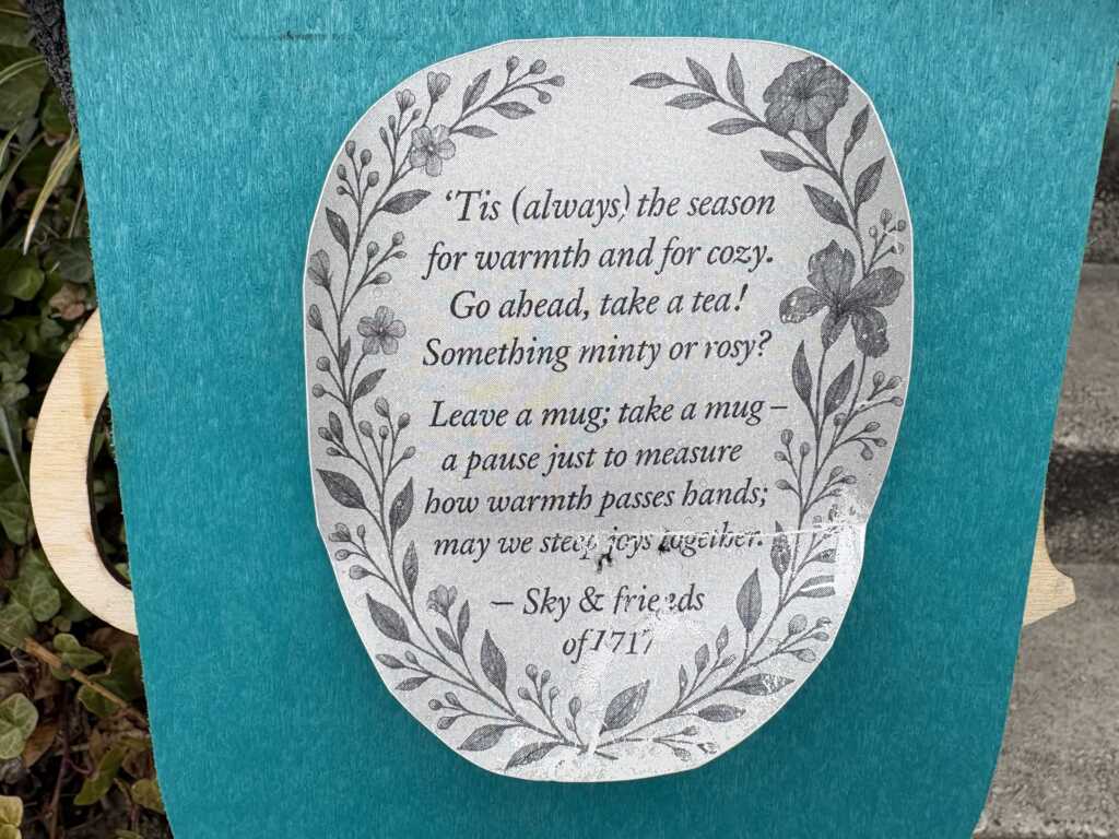 “‘Tis (always) the season for warmth and for cozy. Go ahead, take a tea! Something minty or rosy? Leave a mug: take a mug- a pause just to measure how warmth passes hands; may we steep joy together.