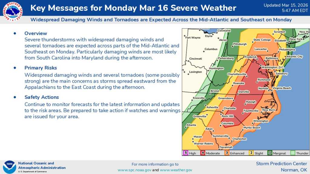 “⚠️For Monday, the Storm Prediction Center has upgraded the area to a Moderate Risk of severe t’storms. Damaging winds (some with gusts up to 65-75 mph) and a few tornadoes (locally stronger) are possible.”