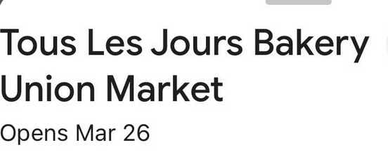 Thanks to Jodi for sending: “French Asian bakery Tous les Jours is coming to 550 Morse Street NE in Union Market, next to Crooked Run Brewery/J&J Pizza. Google Maps just said opening March 26 👀”