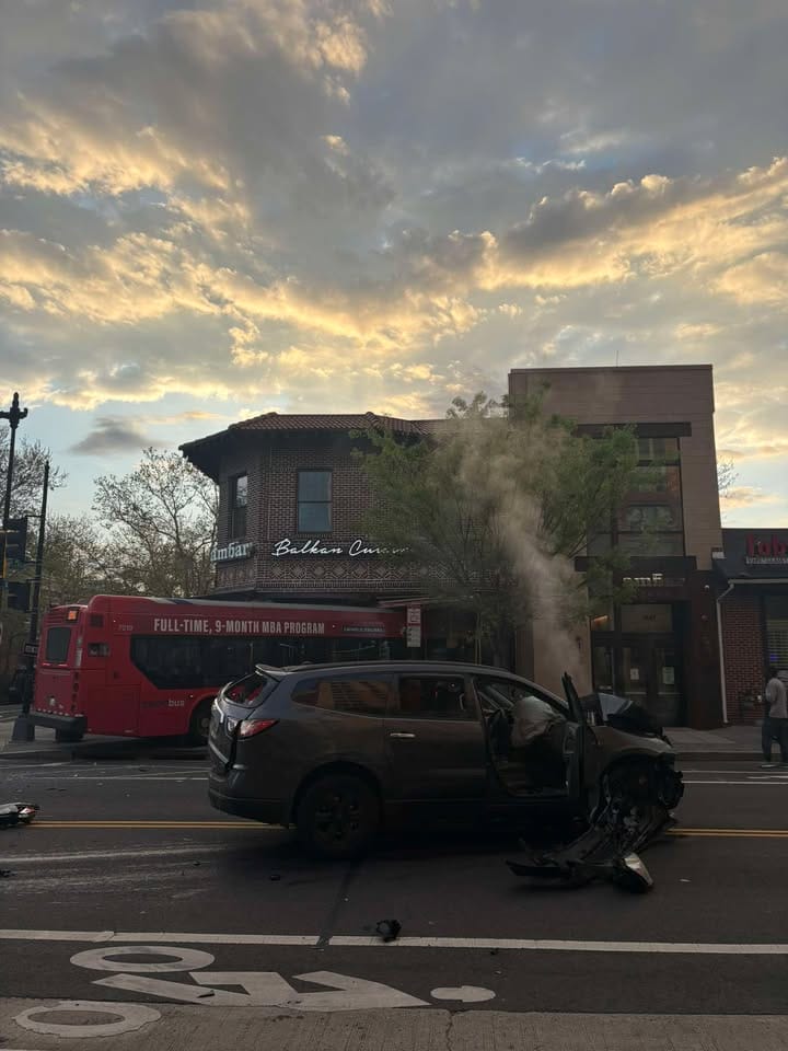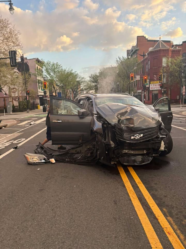 Metro driver told me that a car ran a red light and collided with another and the driver swerved to avoid and ran into ambar. Driver is injured and at the hospital along with a passenger who went through a window… horrible. Thank god it was 7 am or there would be a lot of dead or gravely injured people.”