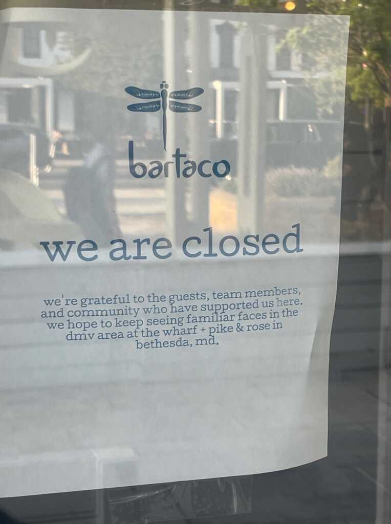 Thanks to Jason for sending last Wednesday: “Looks like BarTaco at 5th & K is calling it quits. Full on moving out kitchen equipment and dining room is almost empty. :(”