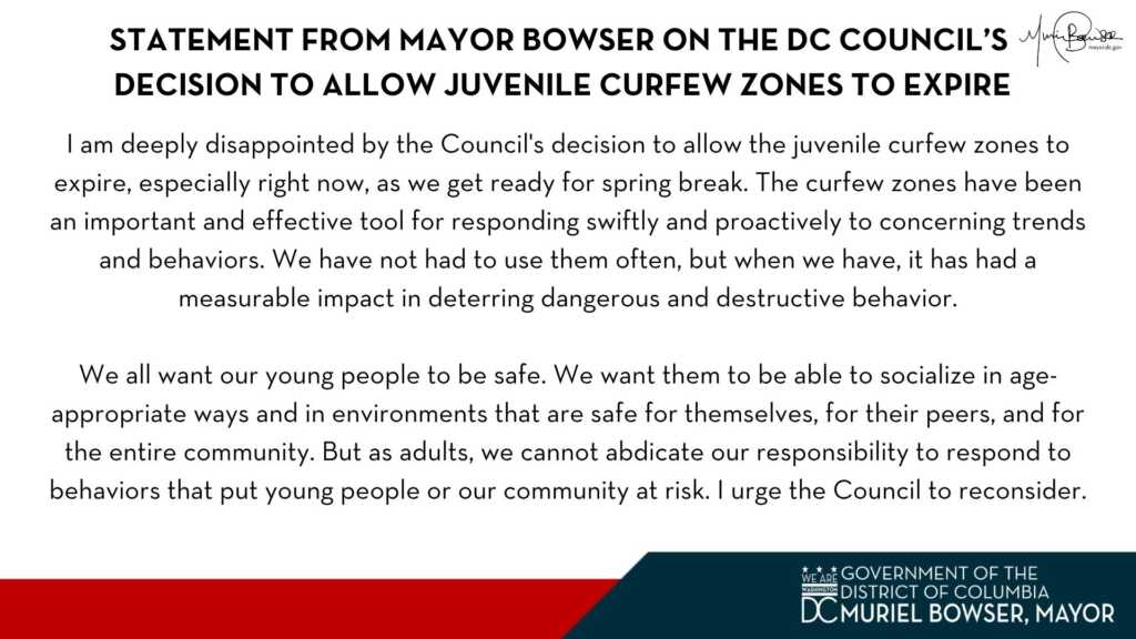 “I am deeply disappointed by the Council’s decision to allow the juvenile curfew zones to expire, especially right now, as we get ready for spring break. The curfew zones have been an important and effective tool for responding swiftly and proactively to concerning trends and behaviors. We have not had to use them often, but when we have, it has had a measurable impact in deterring dangerous and destructive behavior.