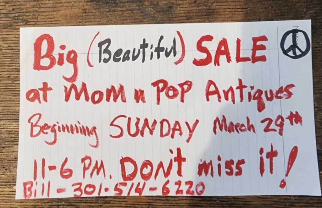 Mom n Pop antiques wrote: “The Big Sale will continue til mid April. Come by for a Deal-of-a-Lifetime! Already low prices wll be shlashed, splashed, dashed and otherwise reduced making your retail stop-off a pretty pleasant experience! Come on by! I think we’ve got something for you!”