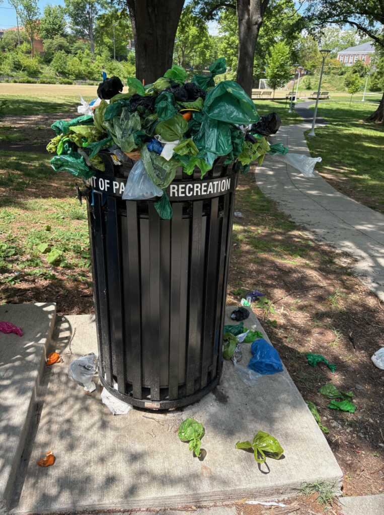 Has D.C. government checked out? Trash cans in Kalorama Park and Walter Pierce Park are all overflowing – and been so for a while.