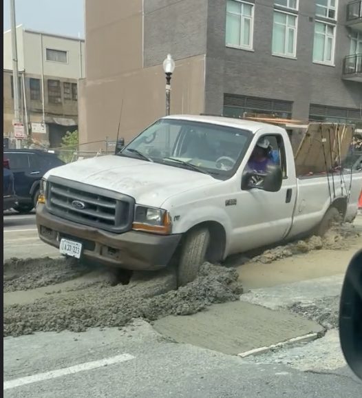 Thanks to A. for sending from NoMa: “Here’s the truck stuck in freshly poured concrete from yesterday.”