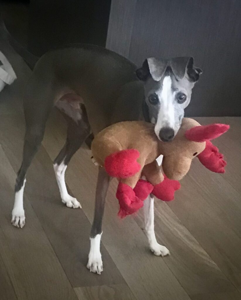 “This is sweet Italian Greyhound Percy, who passed late last year. Please note his concentrating ball face. This smart boy taught himself that holding a stuffy while blocking the goal cage gives him the upper hand during a match.”