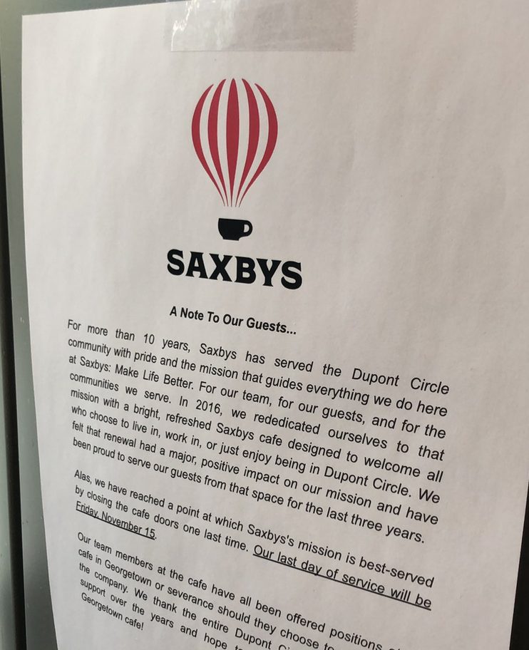 Thanks to Alex for sending news about Saxbys closing in Dupont (1309 19th Street, NW) after today’s service.