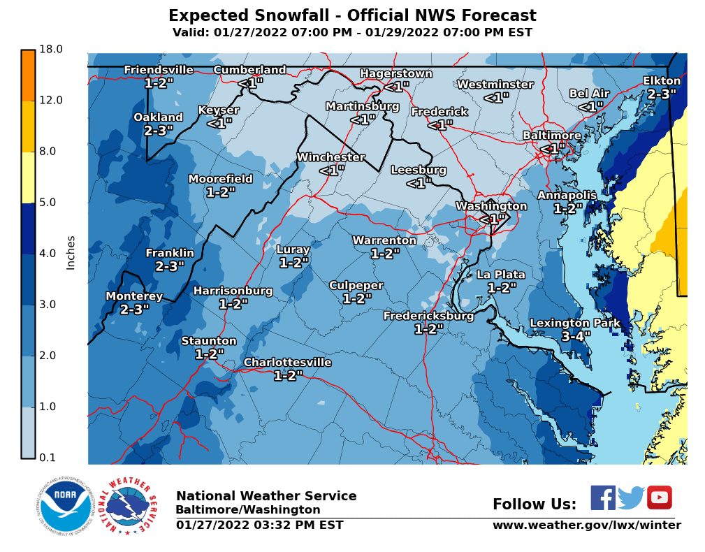 “Winter Weather Advisories have been expanded eastward to include much of the I-95 corridor for Saturday morning. Wind Advisories are also in effect for much of the area. This paired with heavy, wet snowfall could lead to some power outages, especially where heaviest snow falls.”