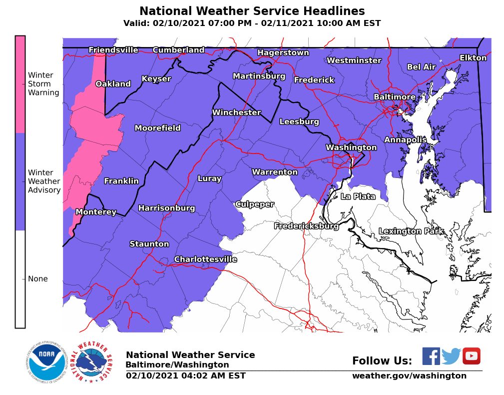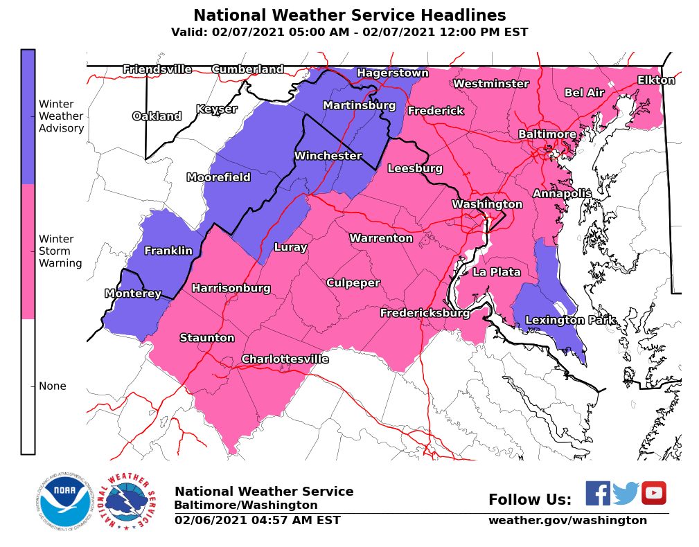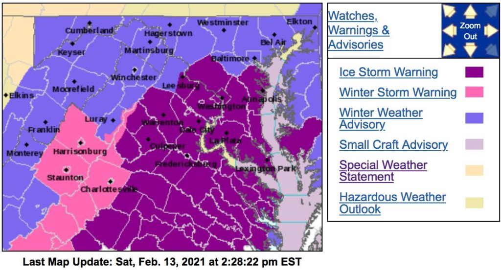 “The National Weather Service has issued an Ice Storm Warning for the District of Columbia, which is in effect from 7PM this evening until 7AM on Sunday, February 14, 2021.