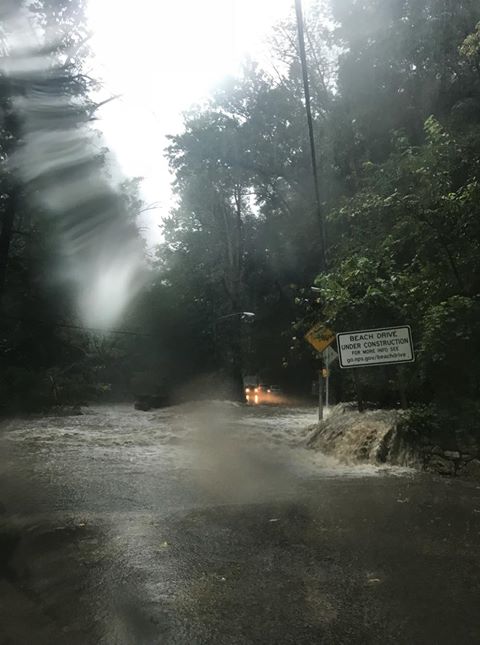 “Parts of rock creek are already crazy flooded. Here’s a photo from beach drive at 1:45 pm. Other cars were stranded on the other side and had to call for roadside help.”