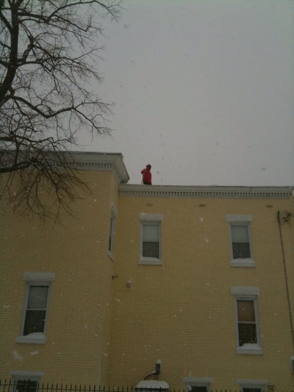 My question is this: Should I shovel my roof? My adjoining neighbor just did so to explore a leak that developed on Sunday and he must have pushed tons of snow off the edge. I wonder if all that weight could breach the roof or cause it to fail? Now there’s more snow coming — more than this house has seen in years — and although my roof has never given me any trouble, it is more than a decade old. If anybody is wondering, my roof has a slight pitch back from the street, probably less than 10%.”