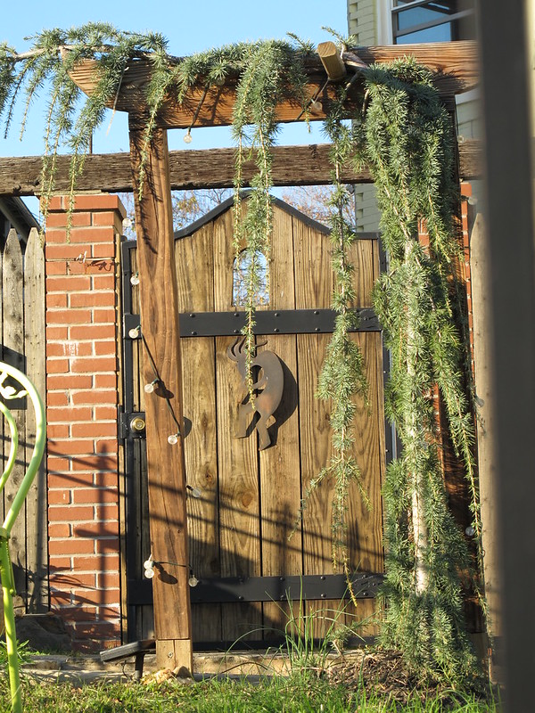 This is a cool looking gate with a frame in front of it. I dig the way the plant hangs off it.