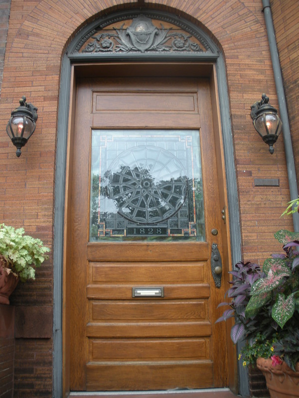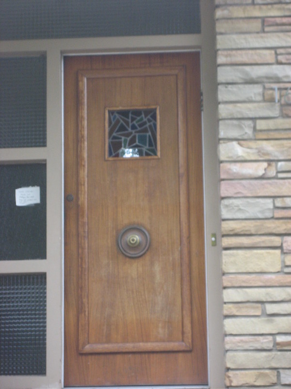 The design etched in this one is pretty unusual. Looks like a pretty old door. It contrasts well with the subtle stained glass numbers above.