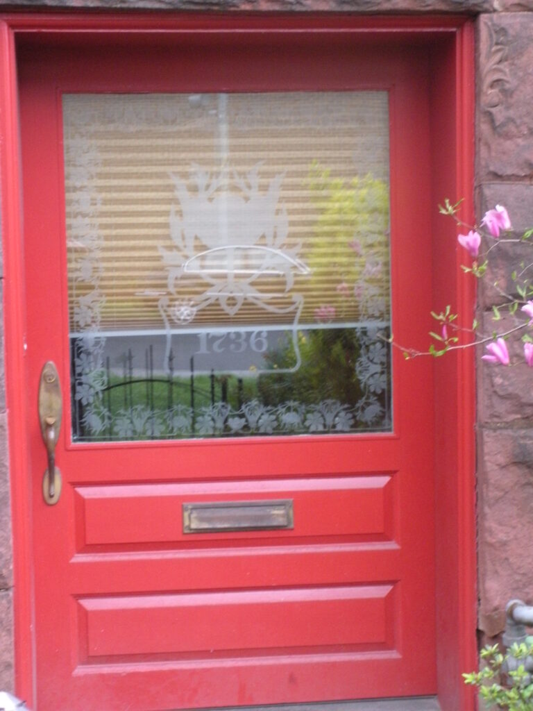This door is located a few down from the “hobbit door” submitted by a reader last week. This one is similarly sized but has sweet etchings on it.