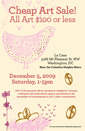 Neighbors’ Consejo is a local nonprofit organization that provides bilingual and multicultural services to the homeless, addicted and low-income residents of the Mt Pleasant, Columbia Heights and Adams Morgan neighborhoods of DC. Their programs include street outreach, counseling and case management, vocational services, addiction treatment, and an advocacy program that promotes civic engagement and develops leadership skills. After 15 years of providing much-needed services, their funds have been drastically cut. Please help them reach their goal of raising $200,000 by the end of the year by purchasing art at the Cheap Art Sale. We will also be taking donations for Neighbors’ Consejo at the art sale, if you would like to donate without buying something. You can also donate funds on their website (