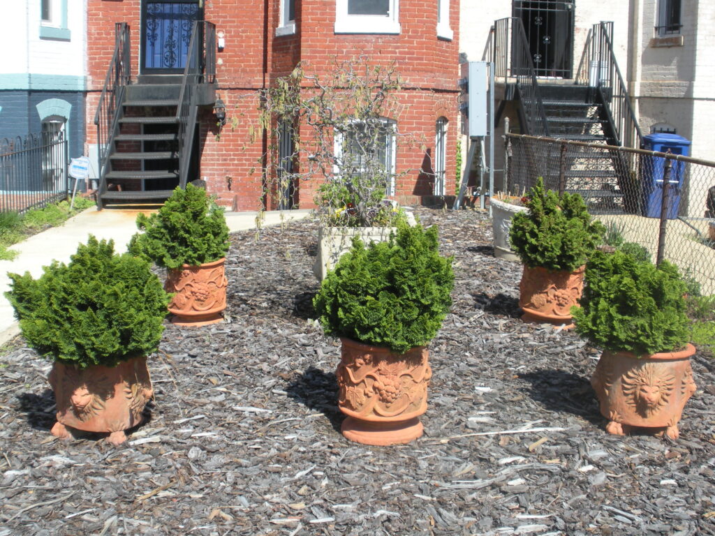 I like how the clay pots and bushes seem to be forming a protective perimeter around the tree in the middle.