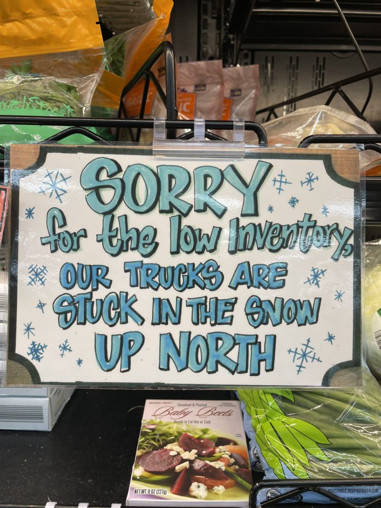 Emir shares with us yesterday: “#traderjoes of 14th street #WashingtonDC has a very low inventory due to the snow storm. They’ll restock Thursday #dc”